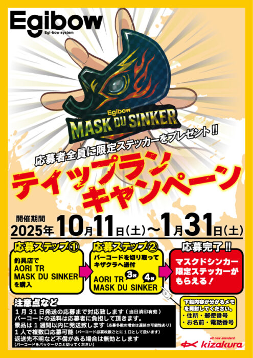 ・釣具店で購入されたAORI TRかマスクドシンカーのバーコードを切り取り、キザクラへ送付(送料はご負担いただきます)