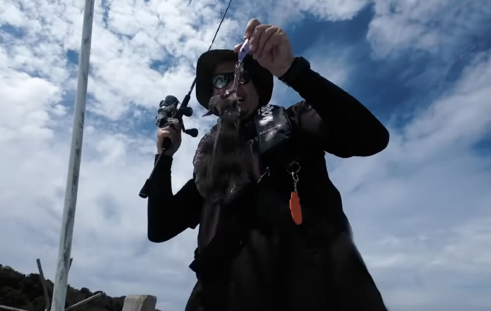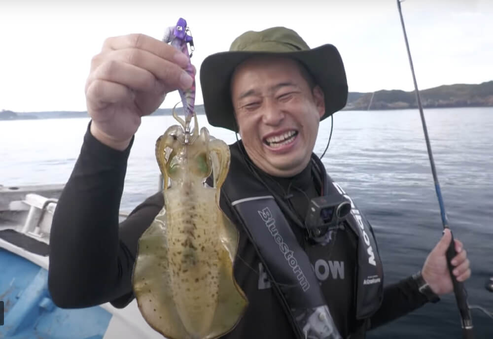 再びポイントとエギをチェンジ。ここで高浪さんもファーストヒット!小ぶりのコウイカだったためやさしくリリースし、次なる大物に期待します。すると間もなく高浪さんが念願のアオリイカをゲット!その後も次々とアタリやヒットを連発させるエギボーブラザーズ。水深や風の様子を睨みながらマスクドシンカーをカスタムしていきます。それにしてもやはりケイムラは強い!