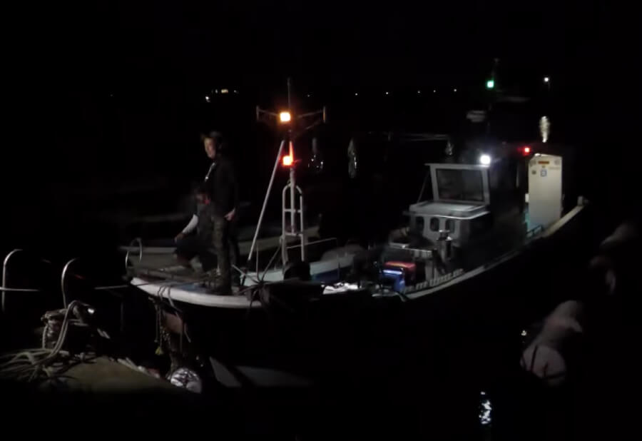 まだ薄暗い明け方、遊漁船スマイルに乗船したエギボーブラザーズ。この時期はアタリが多く、ティップランを始めるにはベストな時期。